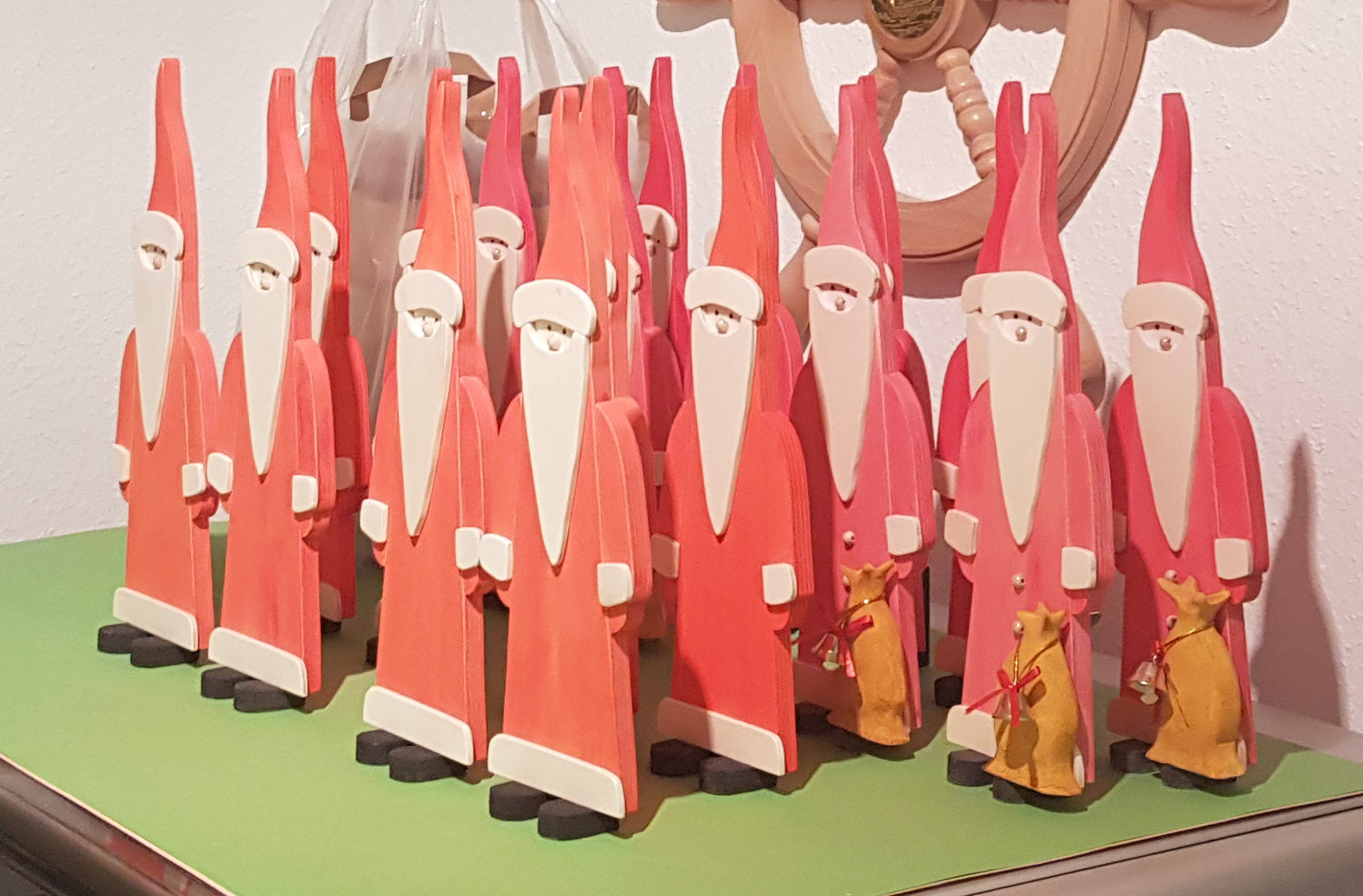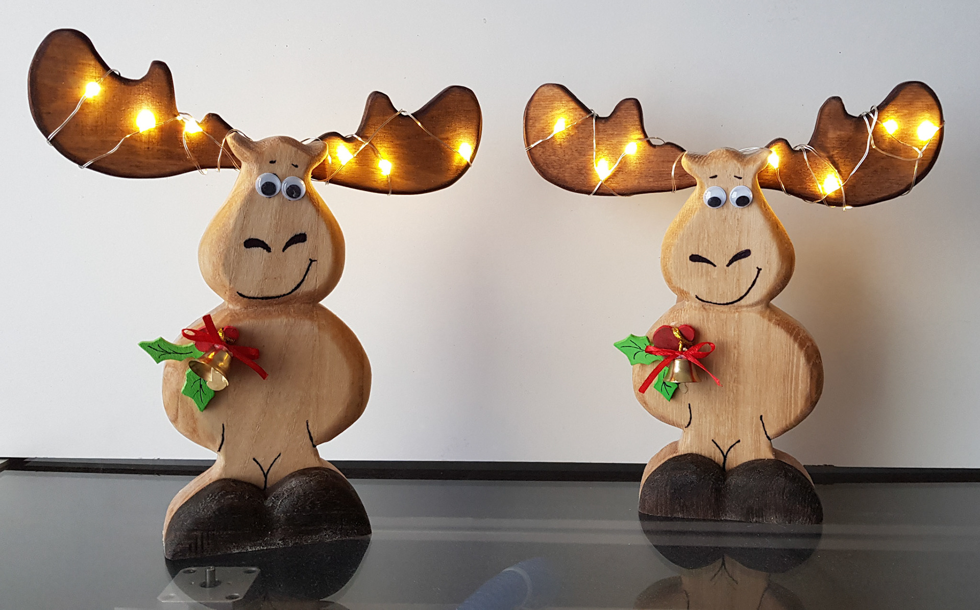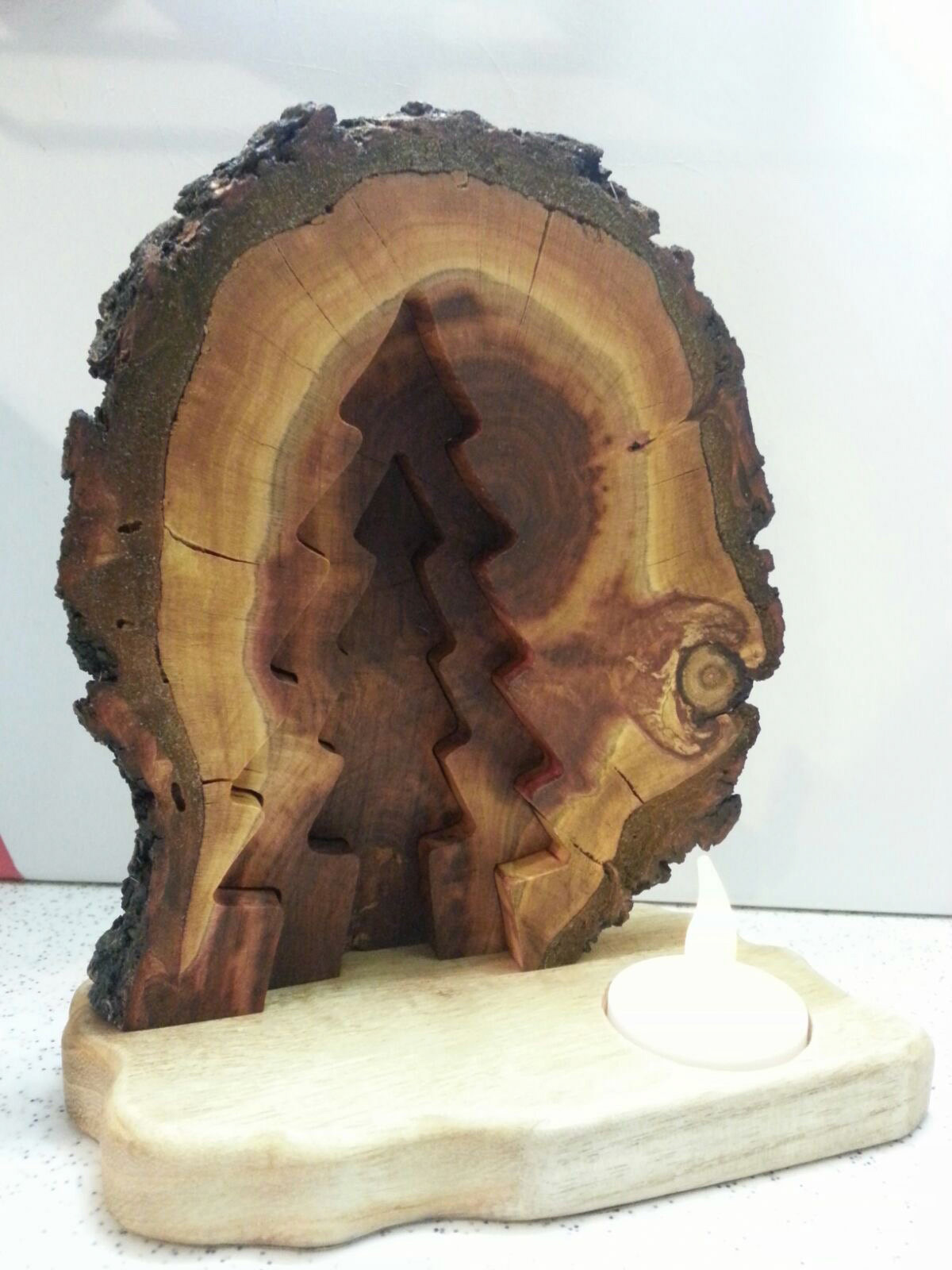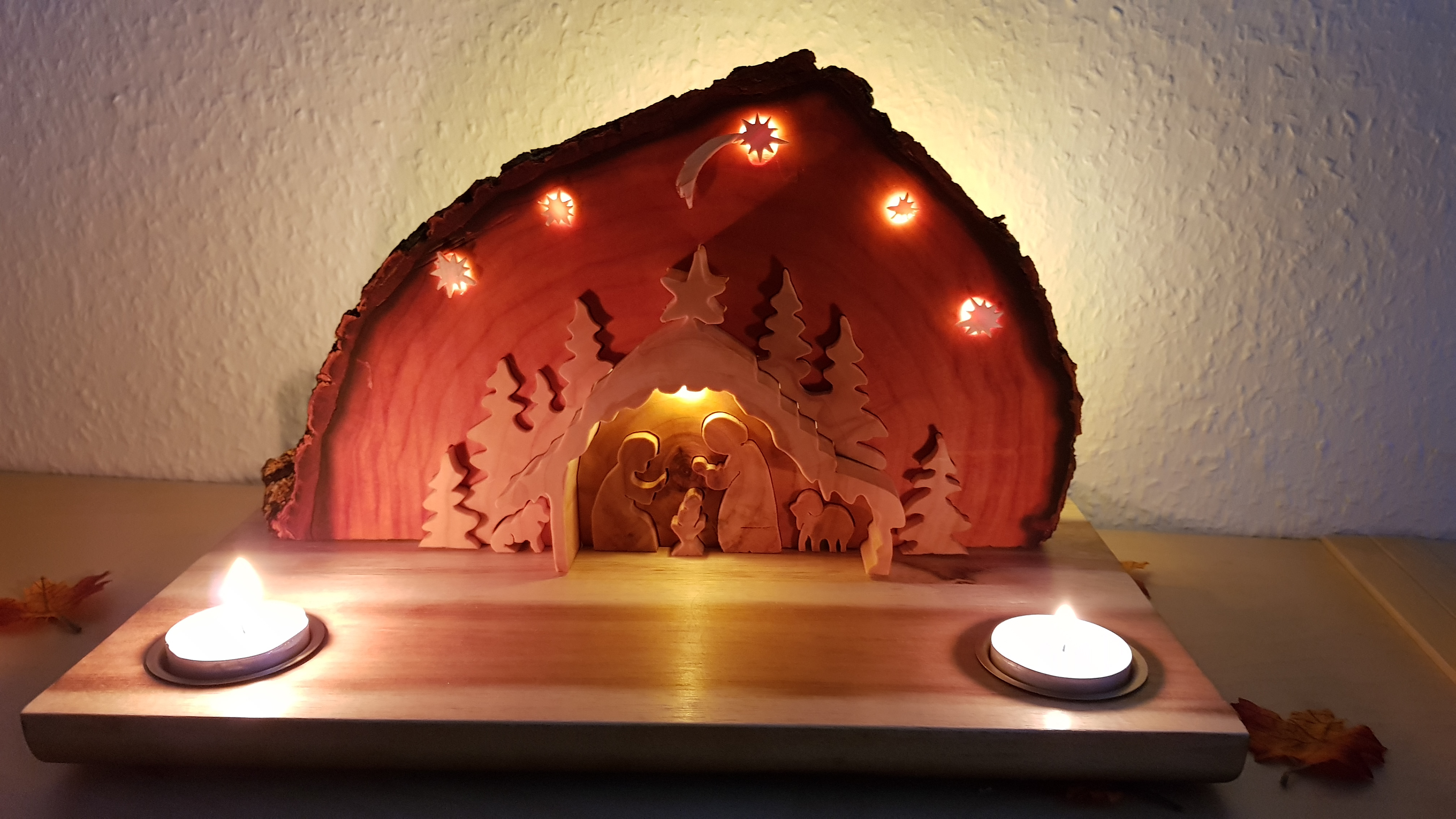 Weihnachtskrippe aus einer Baumscheibe mit Teelichtichtern